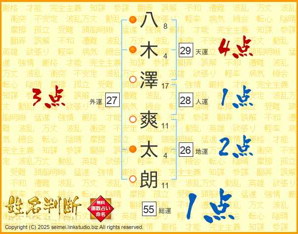 八(8画)木(4画)澤(17画) 爽(11画)太(4画)朗(11画)