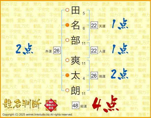 田(5画)名(6画)部(11画) 爽(11画)太(4画)朗(11画)