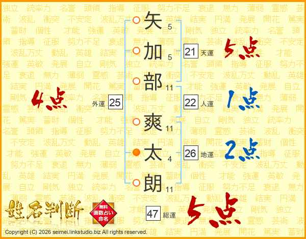 矢(5画)加(5画)部(11画) 爽(11画)太(4画)朗(11画)