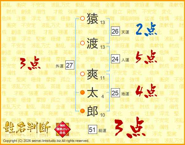 猿(13画)渡(13画) 爽(11画)太(4画)郎(10画)