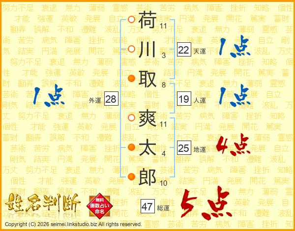 荷(11画)川(3画)取(8画) 爽(11画)太(4画)郎(10画)
