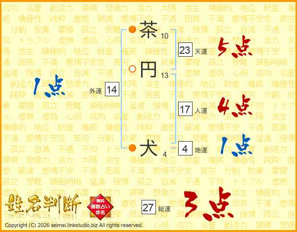 生活面を象徴する運勢です。外部から受ける影響力を表し、結婚運、家庭運や職場、環境への順応性を表します。総運から人運を引いた画数。姓や名が1文字の場合を除く。
