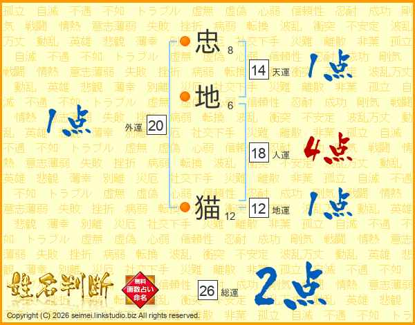 生活面を象徴する運勢です。外部から受ける影響力を表し、結婚運、家庭運や職場、環境への順応性を表します。総運から人運を引いた画数。姓や名が1文字の場合を除く。