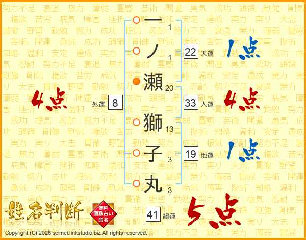 一ノ瀬獅子丸さんの総運は41画の5点!