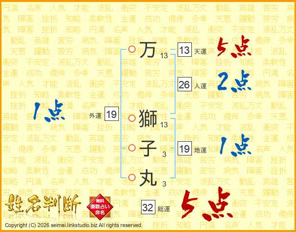 生活面を象徴する運勢です。外部から受ける影響力を表し、結婚運、家庭運や職場、環境への順応性を表します。総運から人運を引いた画数。姓や名が1文字の場合を除く。
