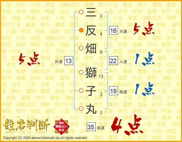 三(3画)反(4画)畑(9画) 獅(13画)子(3画)丸(3画)