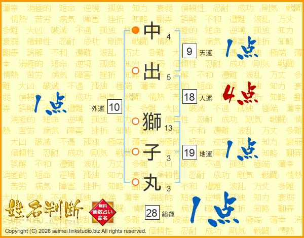 中(4画)出(5画) 獅(13画)子(3画)丸(3画)
