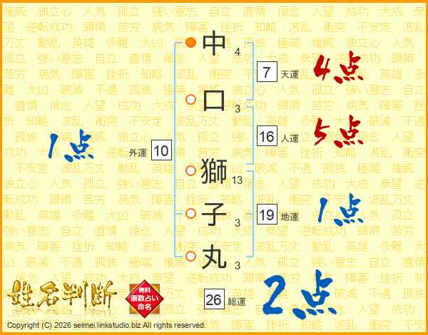 中(4画)口(3画) 獅(13画)子(3画)丸(3画)