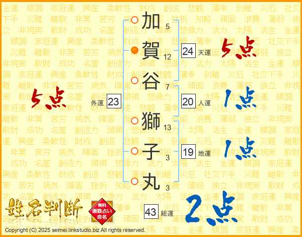 加(5画)賀(12画)谷(7画) 獅(13画)子(3画)丸(3画)