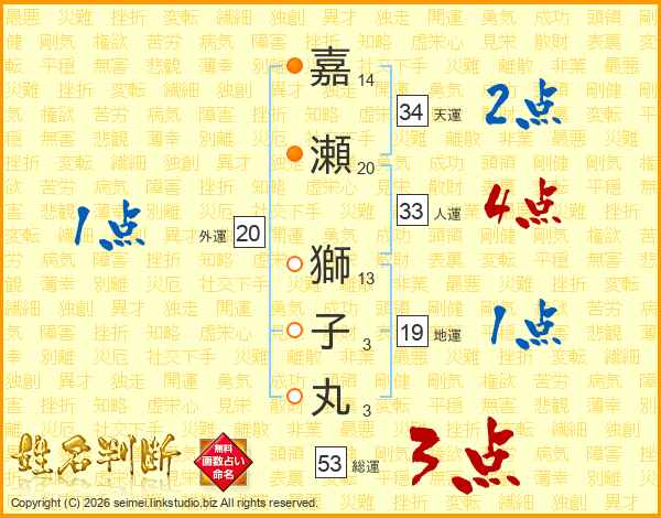 嘉(14画)瀬(20画) 獅(13画)子(3画)丸(3画)