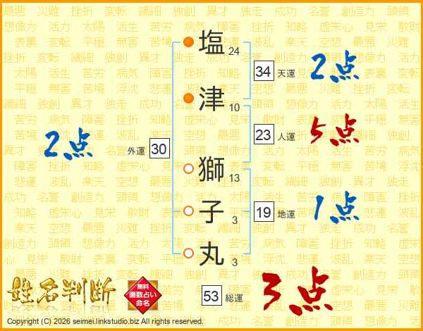 塩(24画)津(10画) 獅(13画)子(3画)丸(3画)