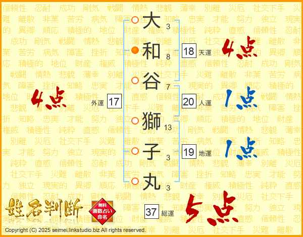 大(3画)和(8画)谷(7画) 獅(13画)子(3画)丸(3画)