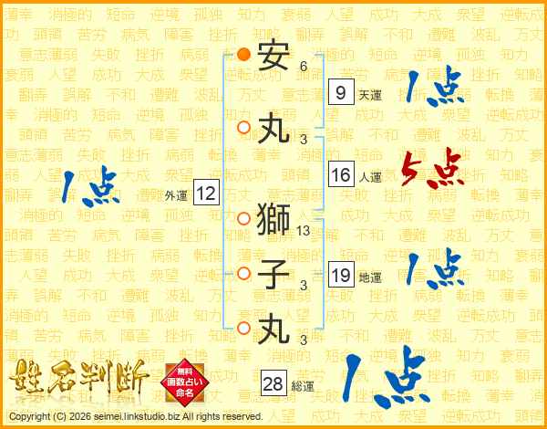 安(6画)丸(3画) 獅(13画)子(3画)丸(3画)