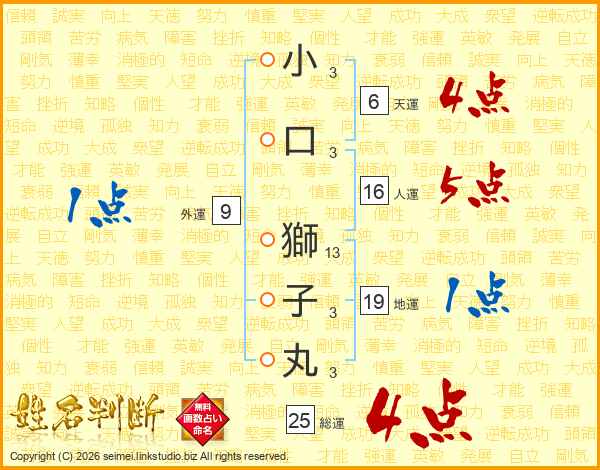 小(3画)口(3画) 獅(13画)子(3画)丸(3画)