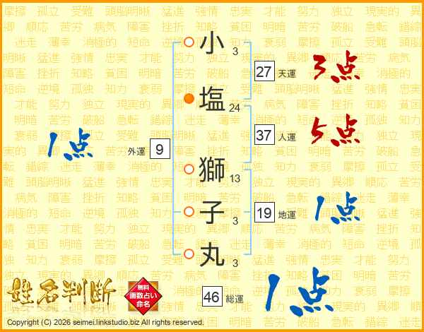小(3画)塩(24画) 獅(13画)子(3画)丸(3画)