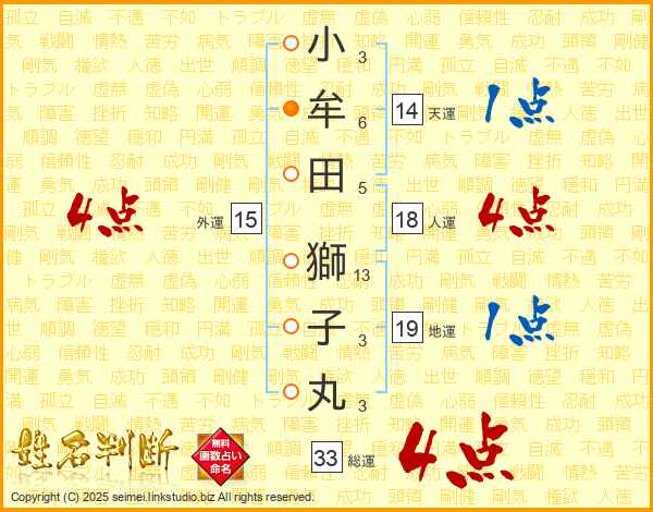 小(3画)牟(6画)田(5画) 獅(13画)子(3画)丸(3画)