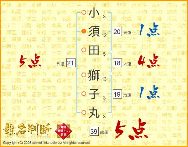 小(3画)須(12画)田(5画) 獅(13画)子(3画)丸(3画)