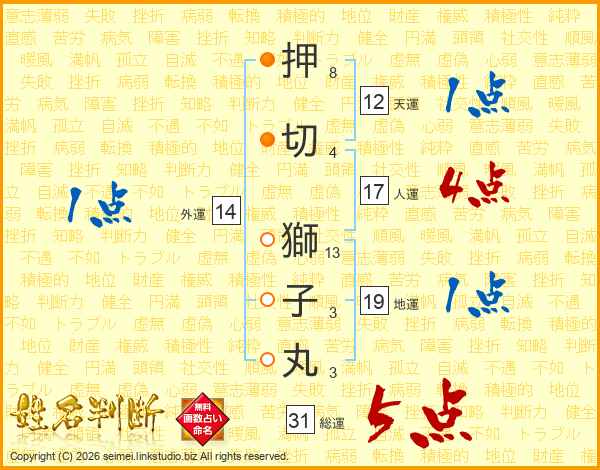 押(8画)切(4画) 獅(13画)子(3画)丸(3画)
