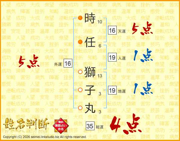 時(10画)任(6画) 獅(13画)子(3画)丸(3画)