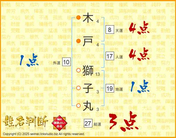 木(4画)戸(4画) 獅(13画)子(3画)丸(3画)
