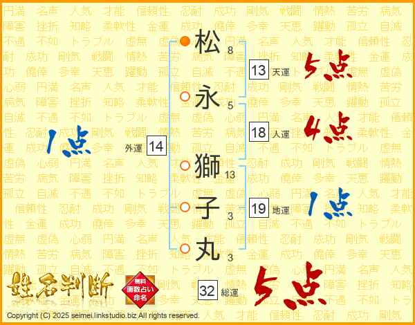 松(8画)永(5画) 獅(13画)子(3画)丸(3画)