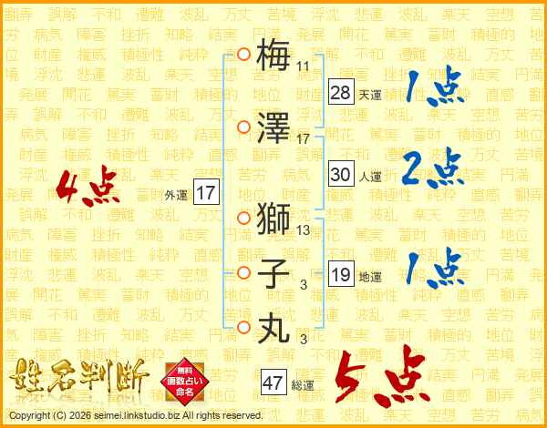 梅(11画)澤(17画) 獅(13画)子(3画)丸(3画)