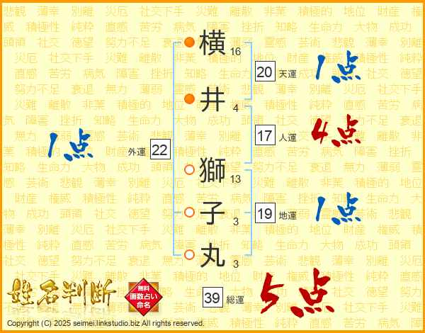 横井獅子丸さんの総運は39画の5点!