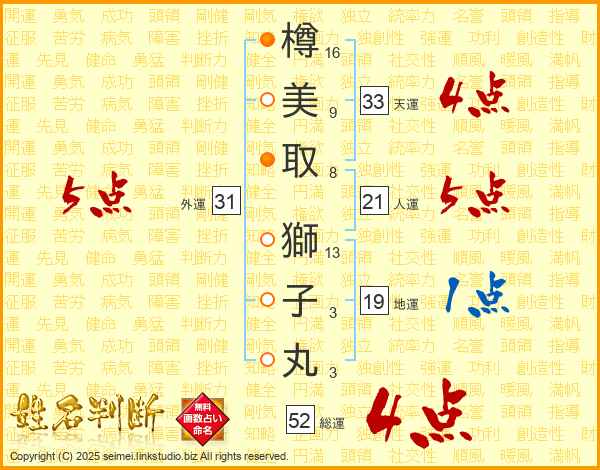 樽(16画)美(9画)取(8画) 獅(13画)子(3画)丸(3画)