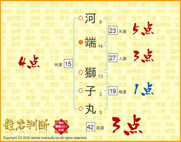 河(9画)端(14画) 獅(13画)子(3画)丸(3画)