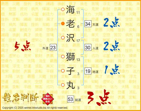 海(11画)老(6画)沢(17画) 獅(13画)子(3画)丸(3画)