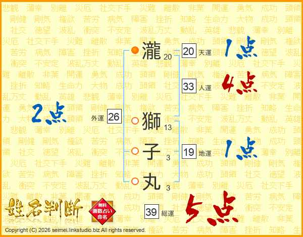 瀧(20画) 獅(13画)子(3画)丸(3画)