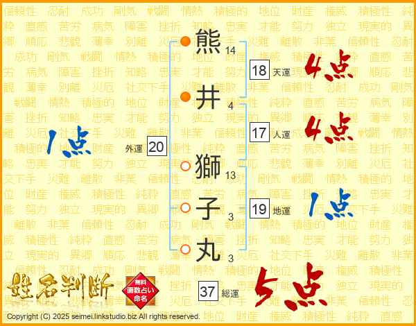 熊(14画)井(4画) 獅(13画)子(3画)丸(3画)