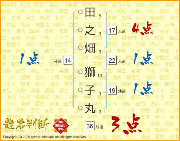田(5画)之(3画)畑(9画) 獅(13画)子(3画)丸(3画)