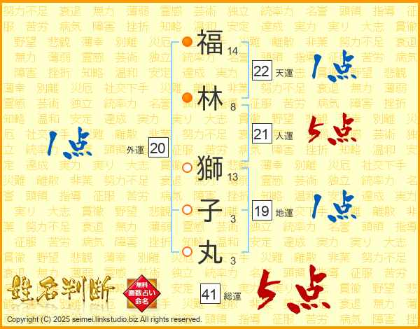 福(14画)林(8画) 獅(13画)子(3画)丸(3画)
