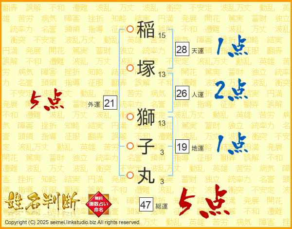 稲(15画)塚(13画) 獅(13画)子(3画)丸(3画)