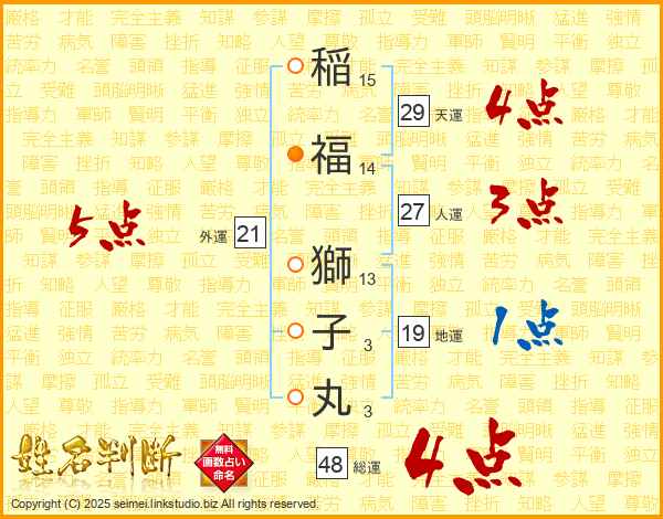 稲(15画)福(14画) 獅(13画)子(3画)丸(3画)