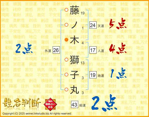 藤(19画)ノ(1画)木(4画) 獅(13画)子(3画)丸(3画)