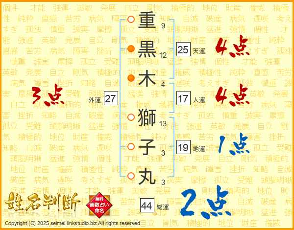 重(9画)黒(12画)木(4画) 獅(13画)子(3画)丸(3画)