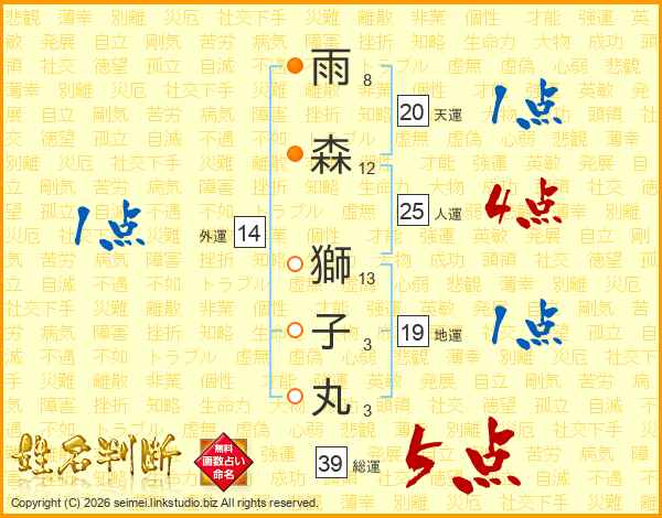 雨(8画)森(12画) 獅(13画)子(3画)丸(3画)