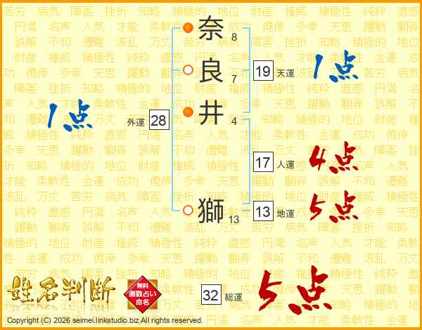 奈(8画)良(7画)井(4画) 獅(13画)