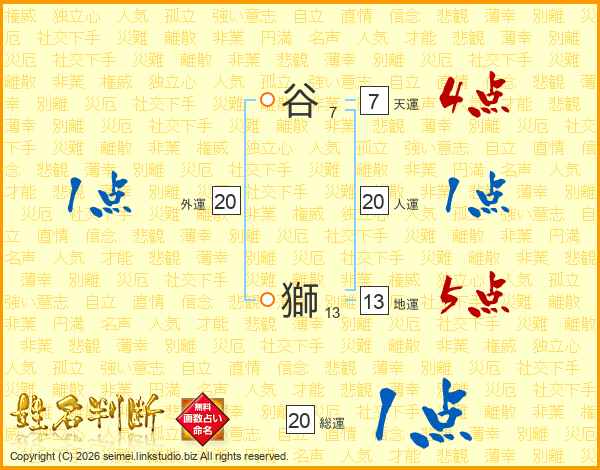生活面を象徴する運勢です。外部から受ける影響力を表し、結婚運、家庭運や職場、環境への順応性を表します。総運から人運を引いた画数。姓や名が1文字の場合を除く。