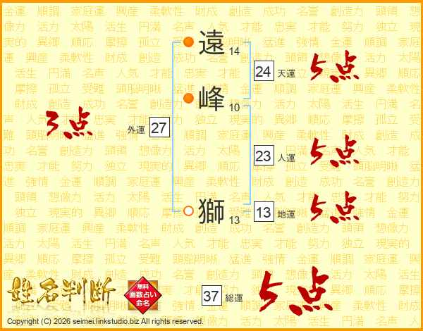 遠峰獅さんの総運は37画の5点!