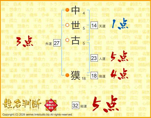 家系が持つ宿命的な運勢を表します。祖先から受け継いだ苗字ですので自分の力が及びません。家柄を象徴します。苗字の合計画数。
