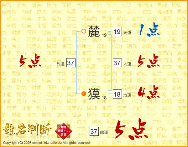 生活面を象徴する運勢です。外部から受ける影響力を表し、結婚運、家庭運や職場、環境への順応性を表します。総運から人運を引いた画数。姓や名が1文字の場合を除く。