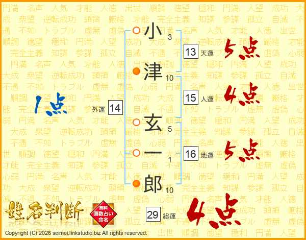小(3画)津(10画) 玄(5画)一(1画)郎(10画)