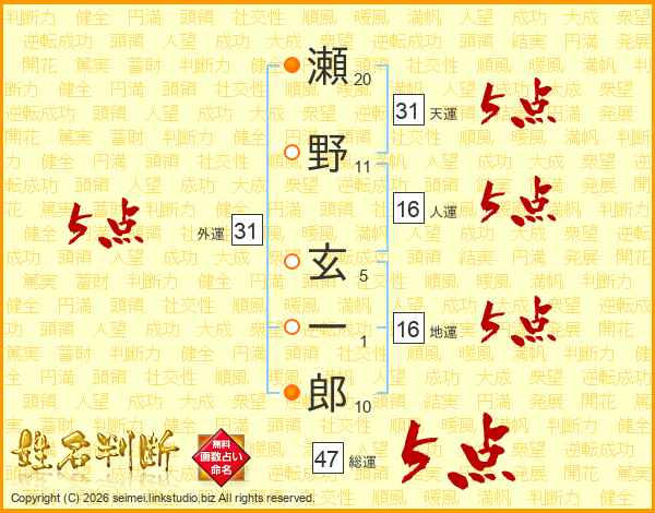 瀬(20画)野(11画) 玄(5画)一(1画)郎(10画)