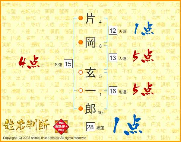 片(4画)岡(8画) 玄(5画)一(1画)郎(10画)