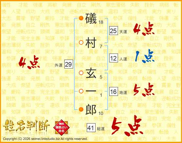 礒(18画)村(7画) 玄(5画)一(1画)郎(10画)