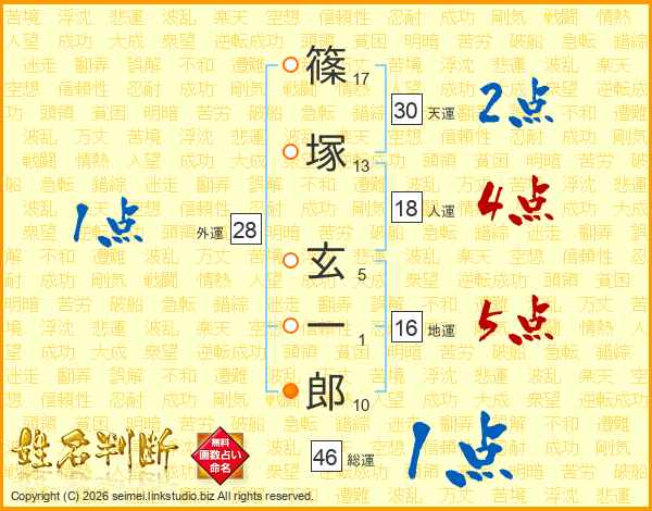篠(17画)塚(13画) 玄(5画)一(1画)郎(10画)