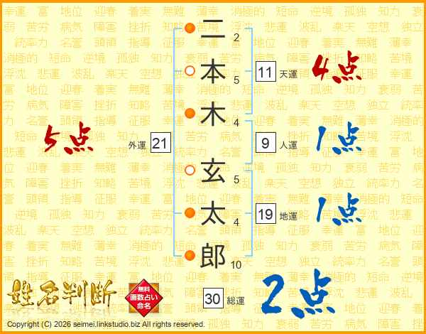 二(2画)本(5画)木(4画) 玄(5画)太(4画)郎(10画)